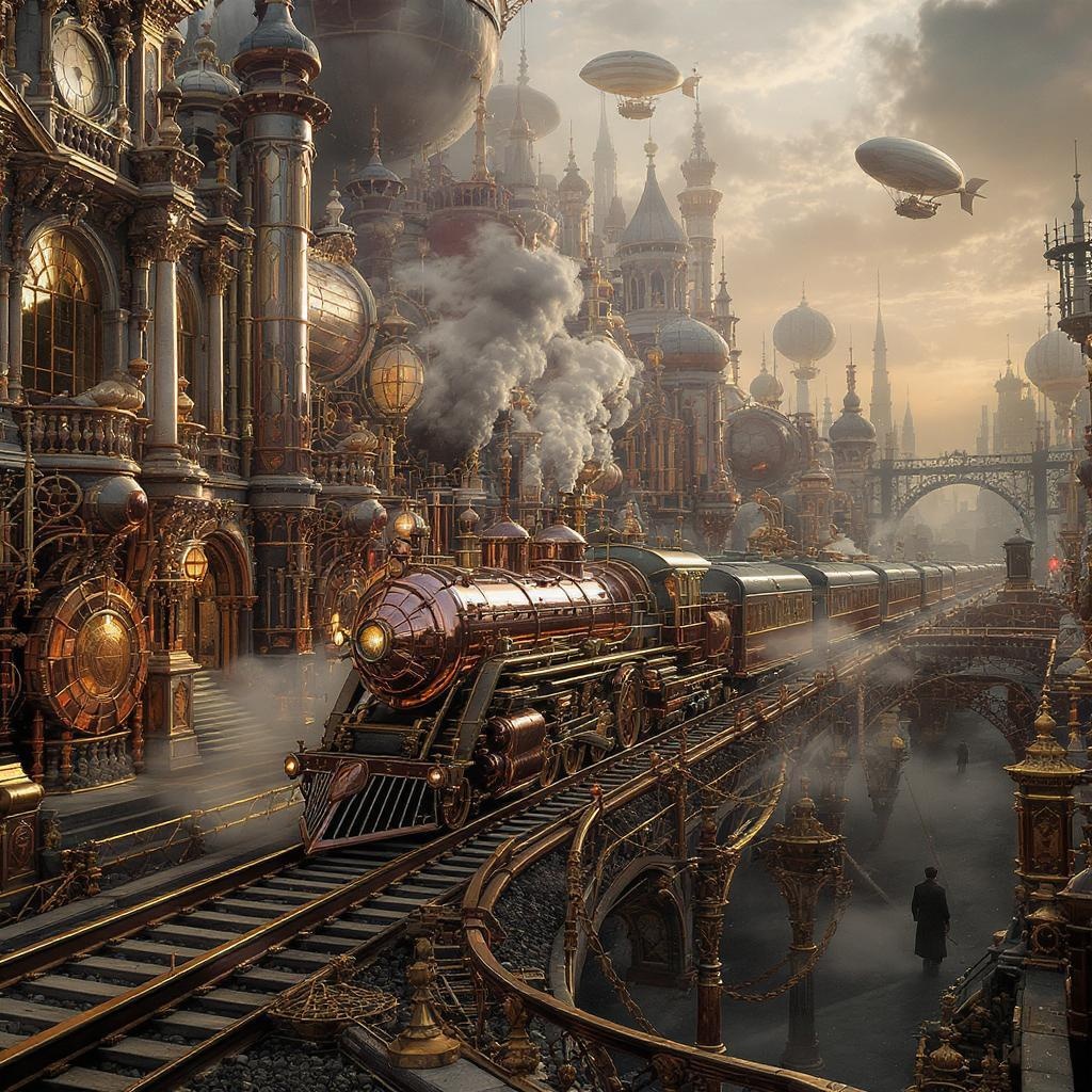 Steampunk-inspired scene featuring a polished copper metallic railroad winding through an ornate, high-detail city with cinematic lighting. The cityscape reflects a retrofuturistic Victorian aesthetic, reminiscent of Lady Mechanika, with intricate biomechanical elements integrated into the buildings. This fantastical setting is influenced by the imaginations of Jules Verne and H.G. Wells, merging advanced technology with classical architecture. The polished surfaces and detailed embellishments shine under HDR lighting, enhancing the scene's depth and texture in stunning UHD 8K resolution. Airships and mechanical constructs move gracefully among the skyline, adding a layer of dynamic life to the cinematic atmosphere.