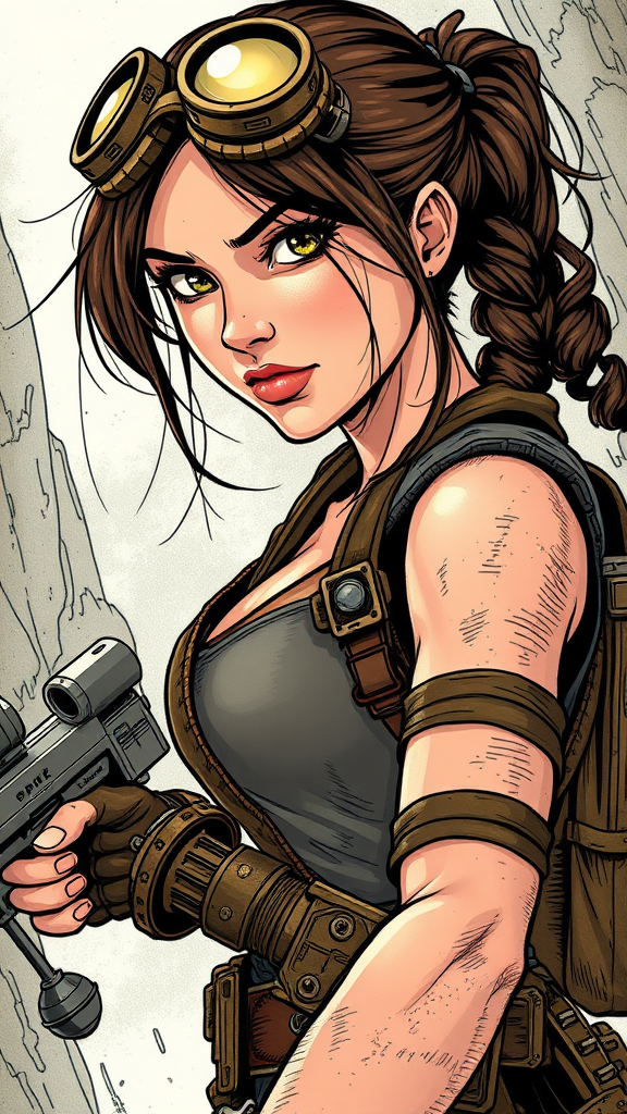 Steampunk interpretation of Lara Croft, intricately detailed in a comic book style reminiscent of Jim Lee, incorporating elements of 3D and cartoon influence, with hints of anime and sketch aesthetics. The image captures her adventurous spirit and ingenuity, enhanced with steampunk gadgetry and Victorian-inspired attire, alongside a vibrant but slightly aged color palette. The scene resonates with a sense of dynamic motion and facial expressiveness, maintaining the essence of exploration and discovery central to her character.