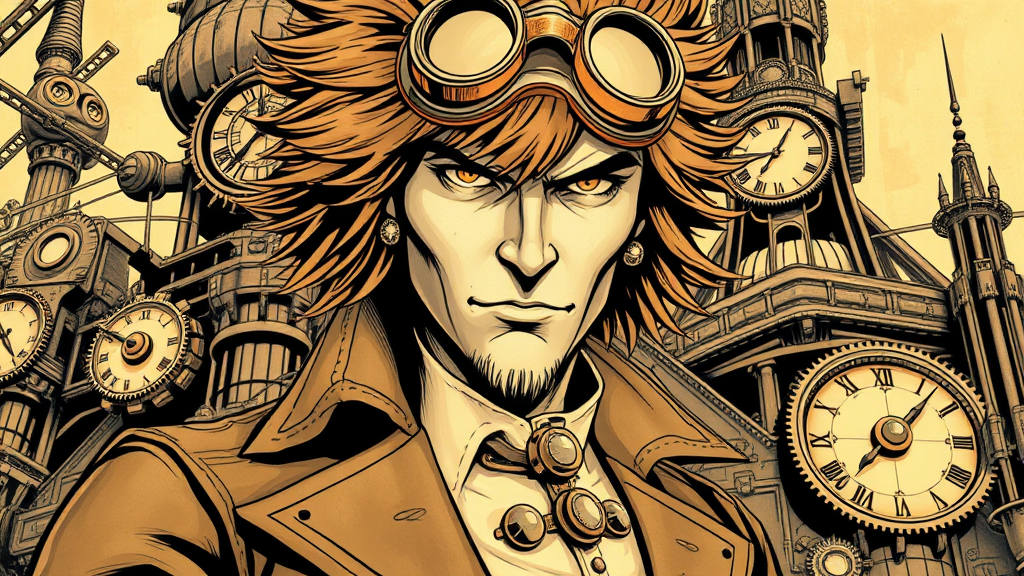 Steampunk Portrait of a Daring Adventurer:4, dynamic comic book style, by Jim Lee, featuring intricate gears and cogs integrated into a high-collared jacket, goggles perched atop a wild mane of hair, an intense gaze filled with determination, set against a backdrop of towering clockwork machinery, with sepia-toned hues highlighting the blend of Victorian elegance and futuristic innovation.