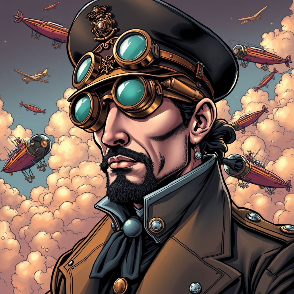 Steampunk portrait of an airship captain:4, illustrated in dynamic comics style reminiscent of Jim Lee, featuring intricate brass goggles and a hat adorned with gears, a high-collared jacket with metallic embellishments, set against a backdrop of floating airships and billowing clouds, blending Victorian elegance with an industrial edge, vibrant color palette with deep shadows and highlights, capturing the essence of adventure and ingenuity.