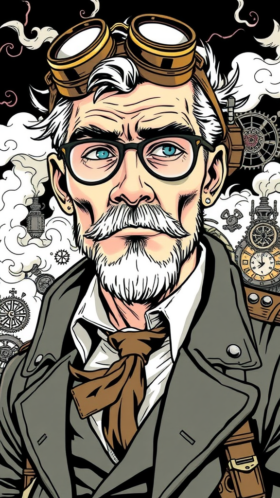 Steampunk portrait of an intrepid explorer:4, illustrated with bold, dynamic lines, capturing an adventurous spirit, featuring intricate gears and clockwork details integrated into a sophisticated outfit, with goggles resting on the forehead, a backdrop of swirling steam and mechanical marvels, in a style reminiscent of Jim Lee, emphasizing expressive expressions and exaggerated perspectives.