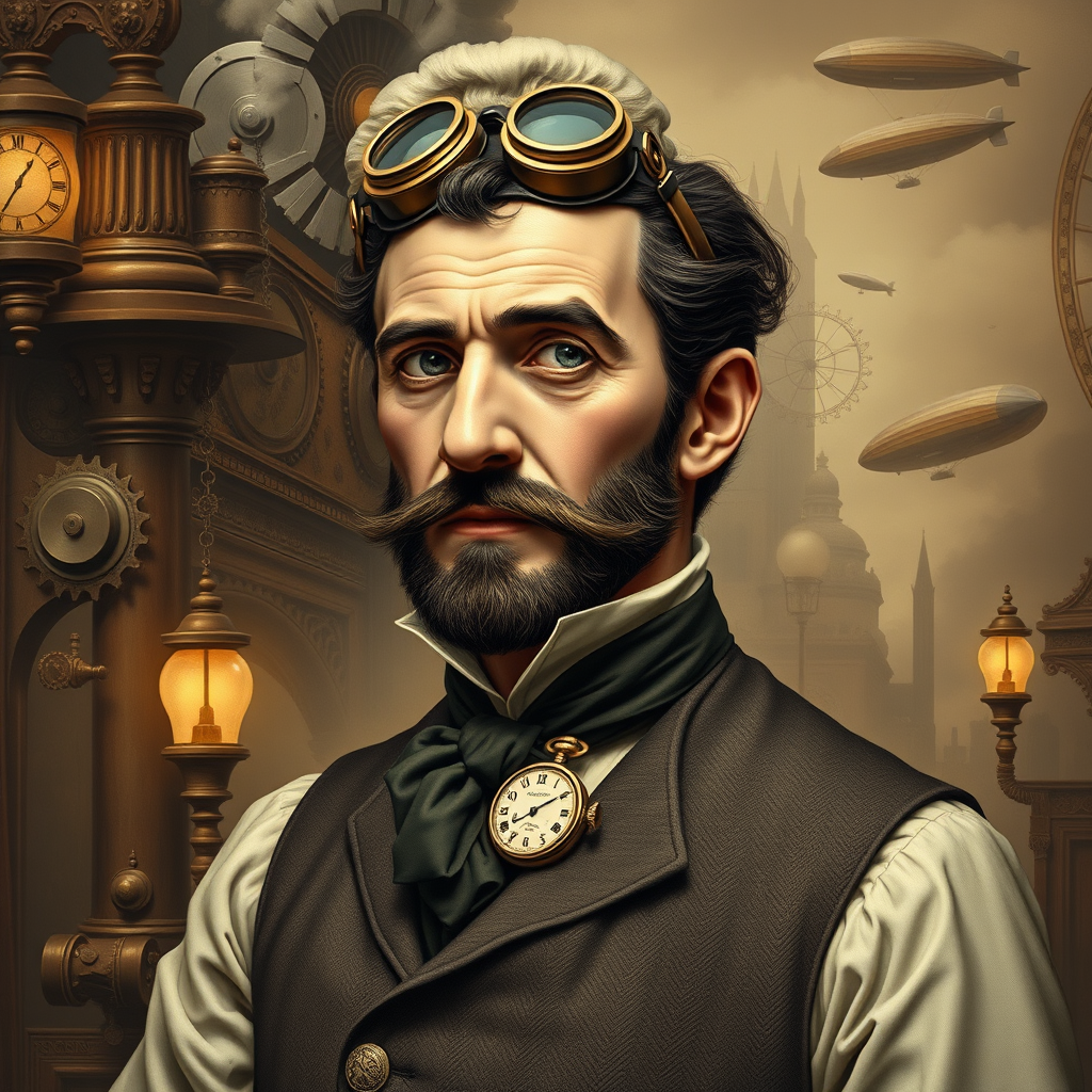 Steampunk portrait of Phileas Fogg, a distinguished gentleman with an air of Victorian elegance, donned in a tailored waistcoat and high-collared shirt, intricate brass goggles perched atop his well-groomed hair, surrounded by an array of gears and cogs in motion, a pocket watch glinting in the ambient glow of gas lamps, a backdrop of billowing steam and a hint of a dirigible floating in a sepia-toned sky.