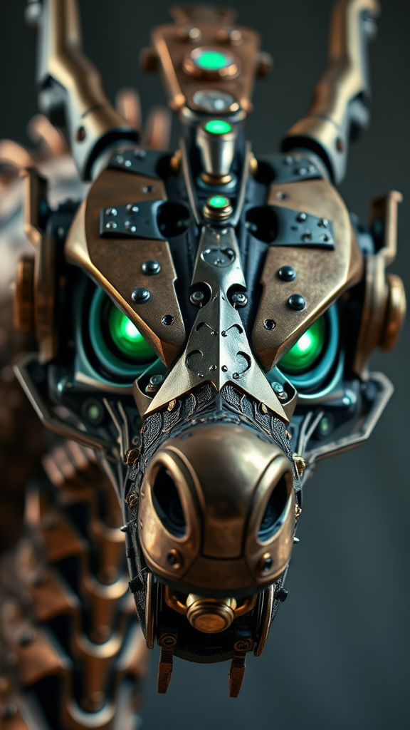 Steampunk robotic dragon headshot, ultra-high detail and sharp focus, capturing intricate mechanical features and brass components, vibrant and trending on artstation, studio-quality photo with high dynamic range, UHD 8K resolution, subtle creative enhancements in design elements to enhance originality, showcasing gleaming copper scales and glowing emerald eyes.