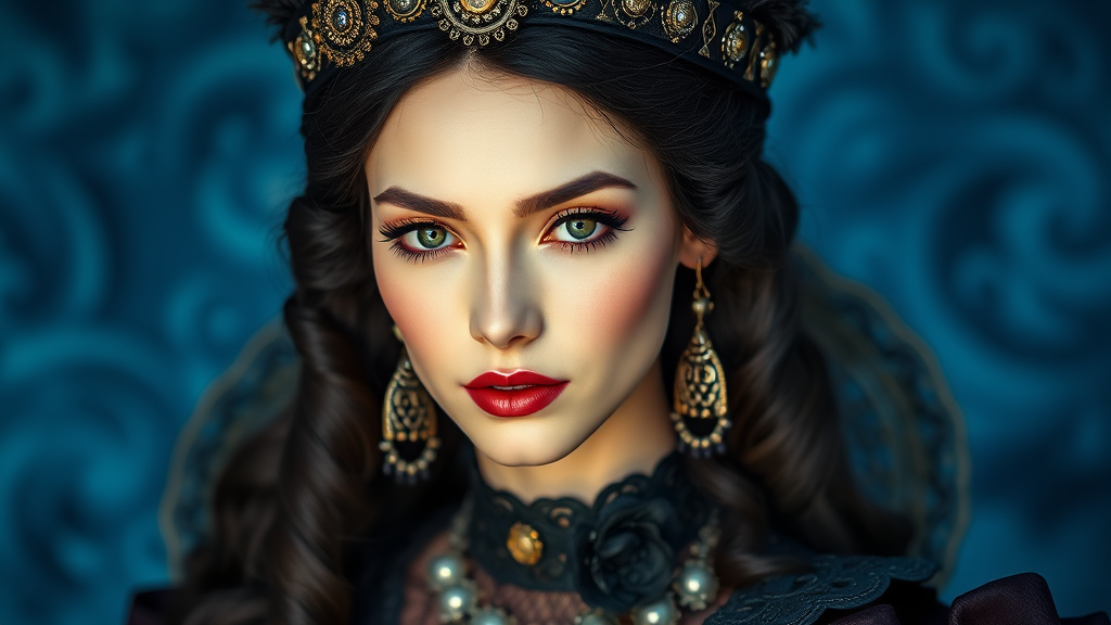 Steampunk royalty with a porcelain complexion and raven tresses, showcasing a detailed facial portrait set against a backdrop of vivid azure hues, adorned in an intricate ebony gown and elegant headpiece, captured in ultra high definition with striking detail and color depth.