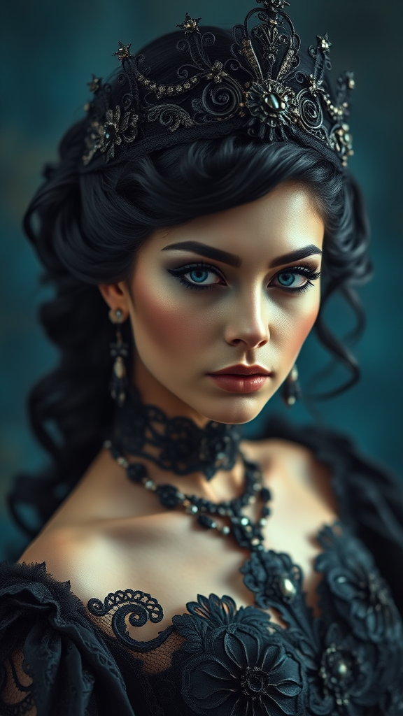 Steampunk royalty with alabaster skin and deep ebony hair, a captivating facial portrait accentuated by vivid cerulean hues, adorned in an elegant, intricate ebony gown and matching ornate headpiece, captured in ultra-high definition, high dynamic range, 8K resolution, exuding a sense of mystery and timeless elegance.