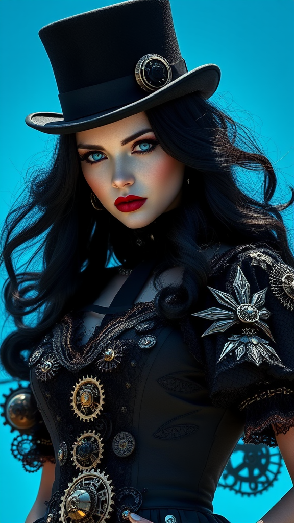 Steampunk royalty with porcelain skin, jet-black hair cascading around her face, her striking blue eyes are a focal point against the vibrant azure backdrop; she dons a meticulously crafted black dress adorned with intricate gears and lace, topped off with a chic black top hat. The image is captured in ultra-high-definition, highlighting every fine detail in spectacular HDR, offering an 8K resolution that brings every element to life with vivid clarity. Her enigmatic expression hints at a story untold, a fusion of elegance and mystery in a captivating steampunk world.