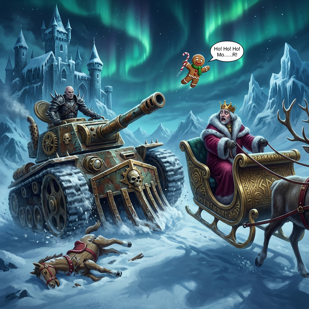 Winter chase scene: a menacing, rusty, steampunk-style tank with skulls and gears, driven by a bald, muscular man in spiked armor, crushing a broken toy horse in the snow. A terrified King in a fur-trimmed robe and golden crown rides a ornate, runic sleigh, being pursued. Above them, a flying gingerbread man, holding a candy cane, shouts "Ho! Ho! Ho! Mo......R!". In the background, a frozen, gothic castle and icy mountains under a dramatic sky with vibrant green aurora borealis. Digital art, highly detailed, dramatic lighting, cool color palette with pops of red and green, adventurous and humorous mood.