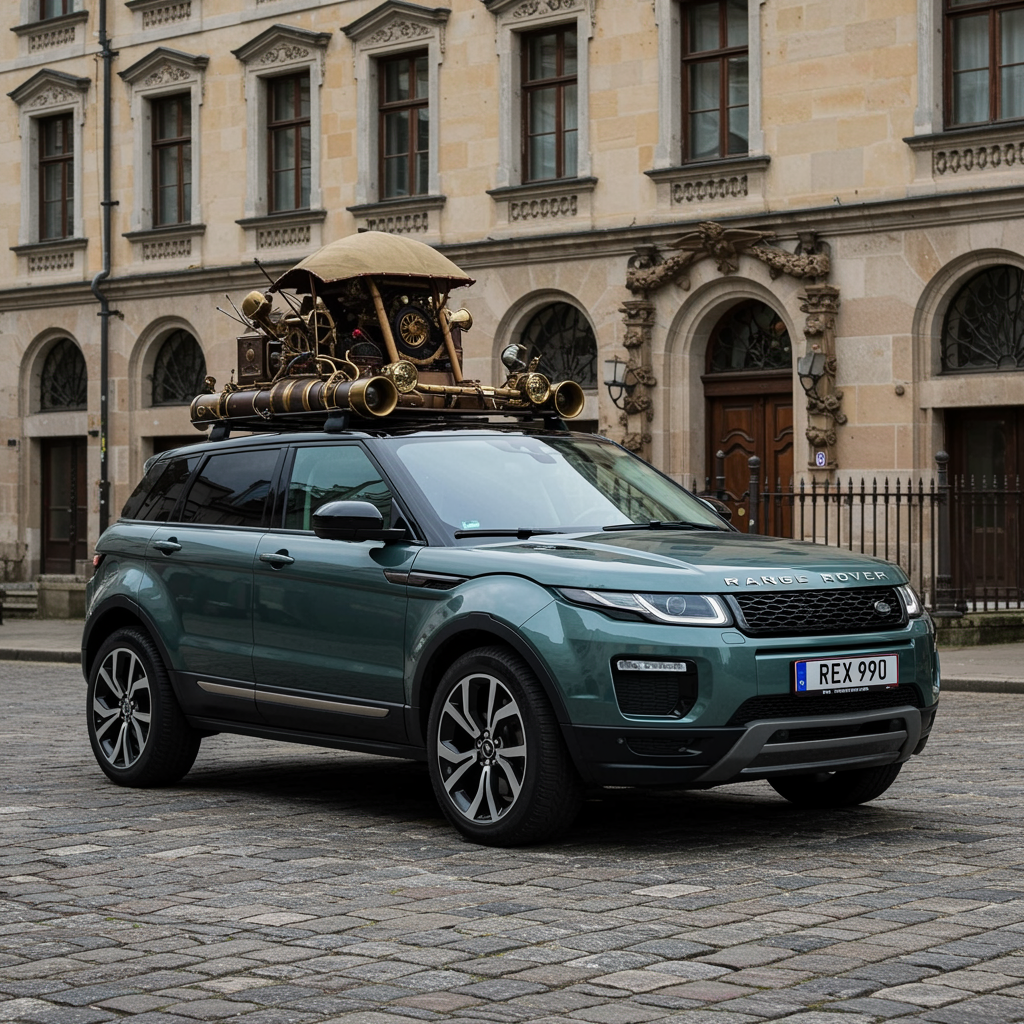 Steampunk tarzında en yeni model gri Range Rover Evoque aracı, göz kamaştırıcı farlarla donatılmış ve yüksek parlaklık için dikkatle cilalanmıştır. Eşsiz bir zarafetle, nostaljik ama görkemli bir eski lüks sarayın önünde parkedilmiş ve çevresini saran ürkütücü bir atmosferle bütünleşmiştir. Yoğun sis, aracın çevresinde mistik bir aura yaratırken, detaylarda sanat eseri Artgerm’in esintileri hissedilir. Hygge'nin huzurlu dokunuşu, bu sahneyi garip bir şekilde rahatlatıcı ve merak uyandırıcı kılar.