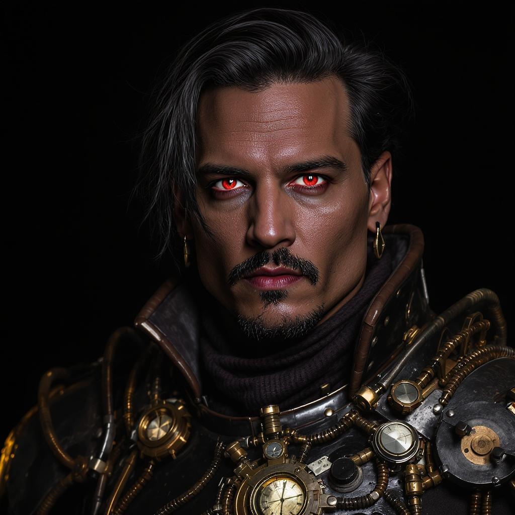 Steampunk, vivid red eyes, jet black hair, inspired by Johnny Depp, symmetrical and well-defined face, highly detailed, ultra hd, hdr, 8k, cinematic, dramatic and stylish studio portrait lighting, illuminated and expressive face, full body view, wearing intricately designed steampunk armor, textural elements, close-up, emphasis on unique features, subtly cropped, focus on a single character, featuring uniqueness and intrigue, distinct narrative elements, creative depiction, unified and balanced composition, refined anatomy and proportions, coherent and engaging portrayal with captivating steampunk aesthetics.