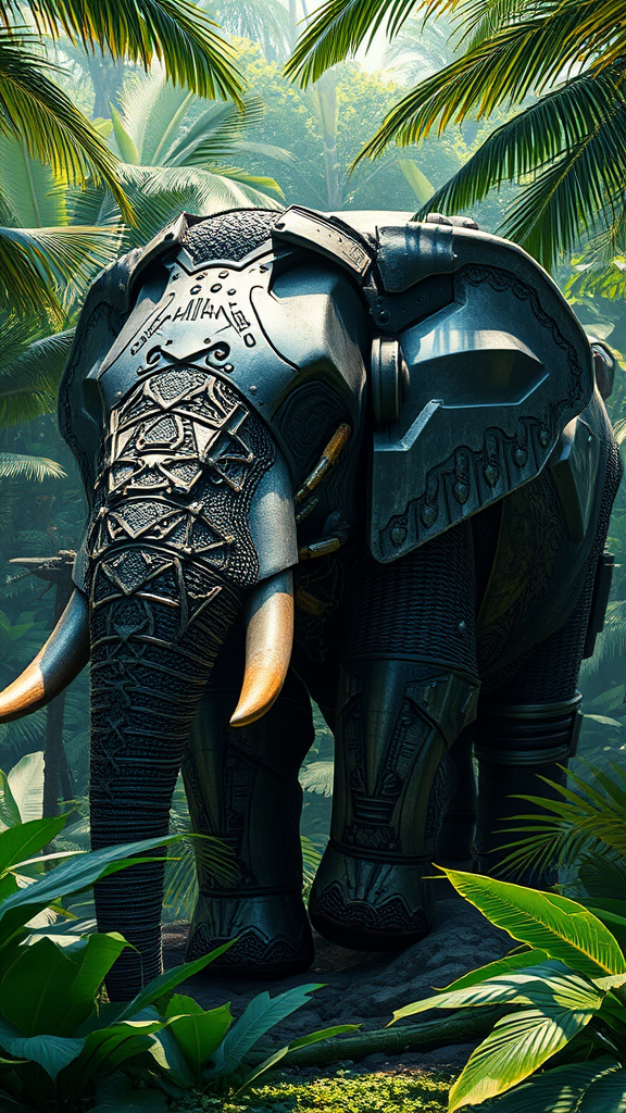 Steel-clad cybernetic elephant with intricate armor plates, set amidst a lush, dense tropical rainforest, light and shadow playing across its surface with sgraffito-like textures revealing underlying patterns.