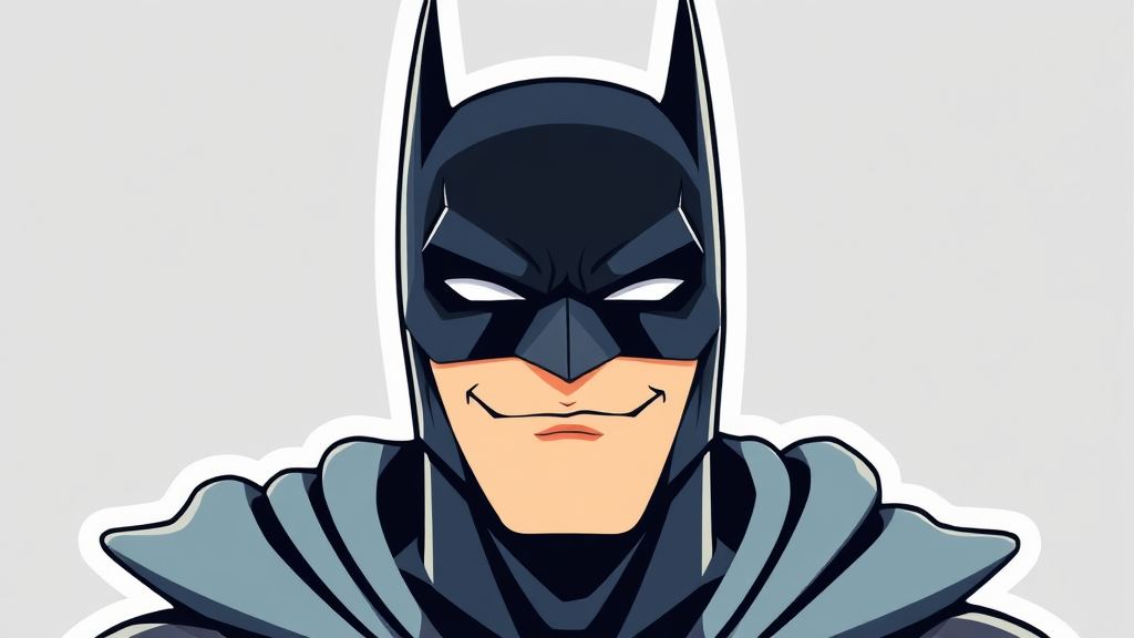 Sticker illustration of Batman featuring a cheeky smirk, rendered in a sleek anime style with a minimalist approach. The design emphasizes sharp lines and a limited color palette, capturing Batman's enigmatic persona. Inspired by trending art styles on platforms like ArtStation, it gives a fresh and modern look to the classic character while maintaining his iconic silhouette.