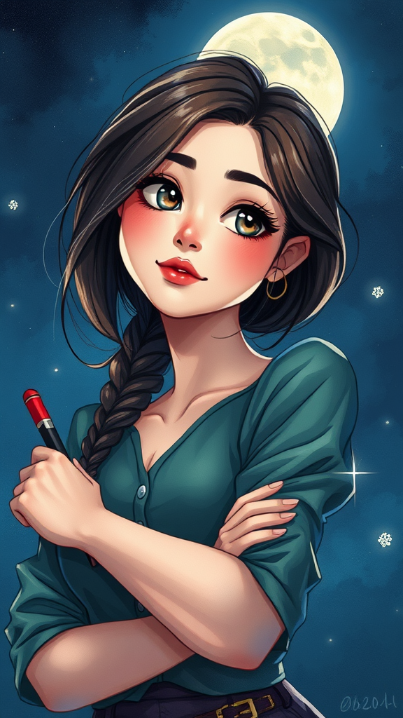 Sticker of a charming female teacher, digital illustration, disney-inspired, rule 63, full body with perfect anatomy, aesthetically pleasing face, abstract beauty, centered composition, direct gaze, approaching perfection, dynamic pose under moonlight, highly detailed and reminiscent of watercolor painting, artstation-quality concept art, smooth and sharp focus, influenced by the art of Carne Griffiths and Wadim Kashin, whimsical and playful, vibrant colors, imaginative elements, gently stylized, capturing the essence of elegance and charm, maintaining artistic coherence and avoiding any deformities or disfigurations.