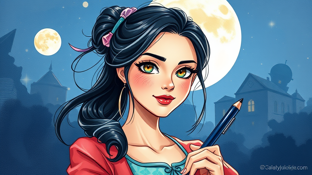 Sticker of a charming female teacher, digital illustration, Disney-inspired, rule 63, full body, impeccable anatomy, stunning face, aesthetically appealing, abstract beauty, centered, engaging eye contact, approaching perfection, dynamic pose, moonlit ambiance, highly detailed, watercolor painting style, artstation quality, concept art, smooth texture, sharp focus, illustration, reminiscent of art by Carne Griffiths and Wadim Kashin, cropped view, slight abstract elements, dreamlike, vibrant colors, whimsical essence.