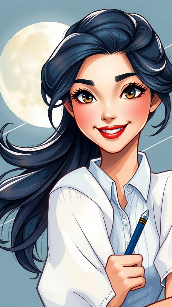 Sticker of a charming female teacher, digital illustration, disney-inspired, rule 63, full body, impeccable anatomy, exquisite face, aesthetically pleasing, abstract beauty, centered composition, engaging the viewer, near perfection, dynamic, touched by moonlight, highly detailed, watercolor painting style, featured on artstation, concept art, smooth and sharp focus, inspired by the art of Carne Griffiths and Wadim Kashin, vibrant and joyful expression, harmonious proportions, seamless integration, harmonious flow, with an air of grace and elegance, vividly expressive, subtly radiant colors, dreamlike atmosphere, delicate yet distinct, evoking a sense of wonder and admiration.