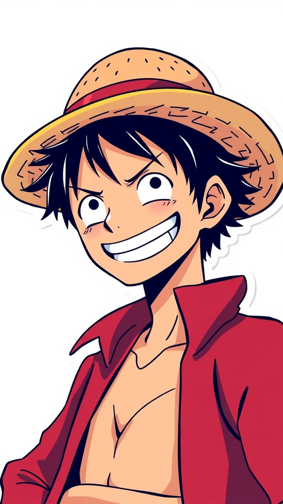 Sticker of anime character inspired by Monkey D. Luffy, featuring iconic straw hat and playful smirk, minimalist design with vibrant colors, portrait orientation 2:3 aspect ratio, stylized with artistic flair for a unique and playful anime aesthetic.