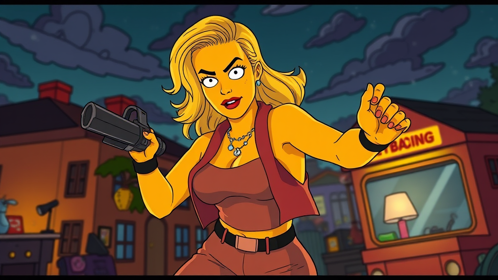 Still image of Margot Robbie depicted in the style of The Simpsons by Matt Groening, full body view in a dynamic action pose, cinematic and epic atmosphere, background complimentary to her character, with cinematic rim lighting and artful color grading, light yet effective shading, highly detailed, vibrant and colorful, rendered in 4k resolution, aspect ratio 2:3, vivid and eye-catching.
