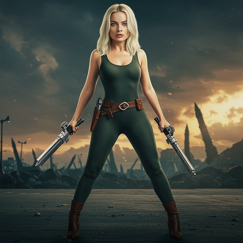 Still image of Margot Robbie reimagined as a character from The Simpsons, drawn in the style of Matt Groening, featuring a full-body view in a dynamic action pose, with an epic and cinematic background that complements the character, showcasing cinematic rim lighting and color grading, with subtle light shading, highly detailed in 4k resolution, vibrant and colorful, in an aspect ratio of 2:3.