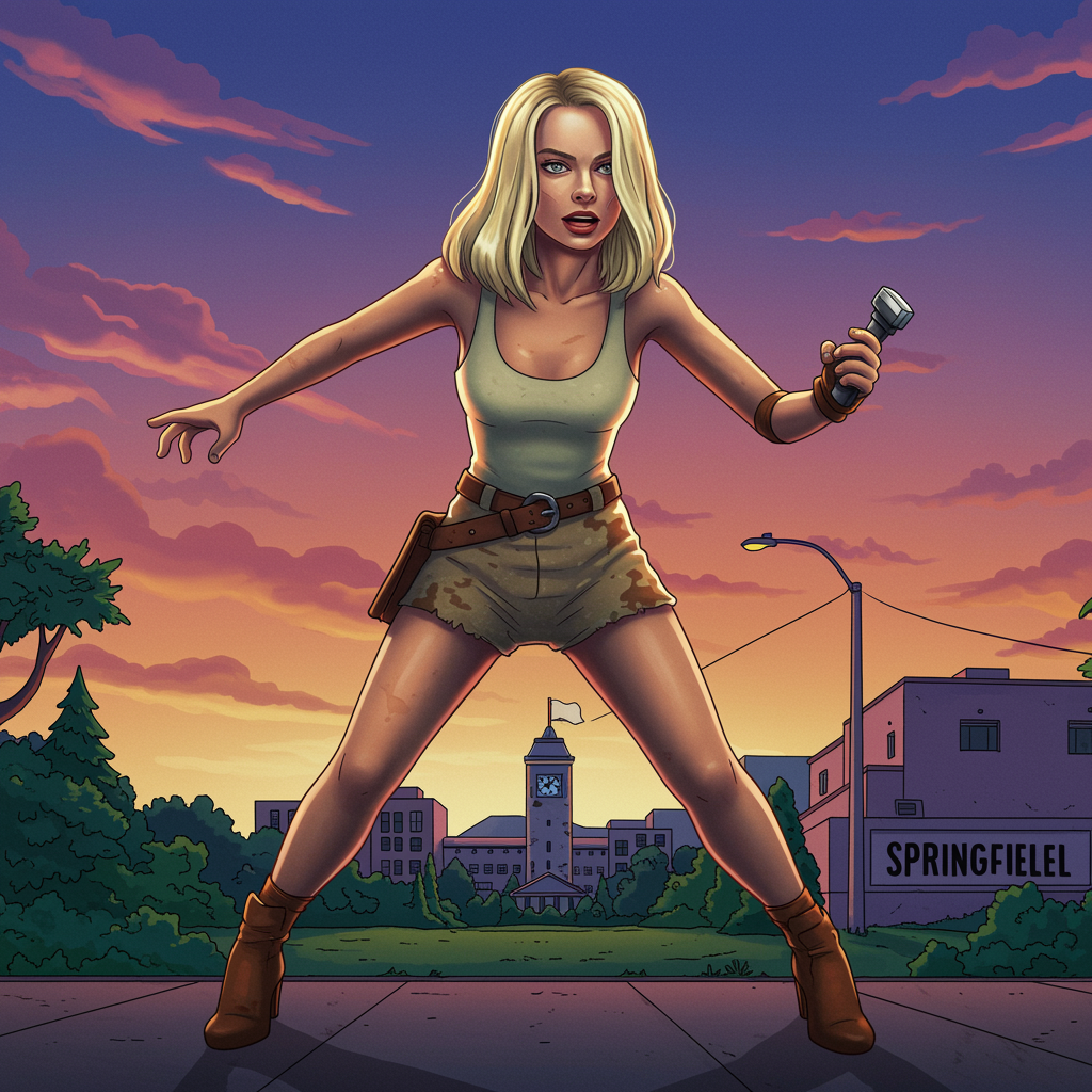Still image of Margot Robbie reimagined in The Simpsons style by Matt Groening, full body view, dynamic action pose, cinematic and epic feel, set against a vibrant Springfield background that complements the character, cinematic rim lighting highlights, expertly color graded, subtle light shading, highly detailed, 4k resolution, bursting with color, aspect ratio 2:3, quality level 2, version 4.
