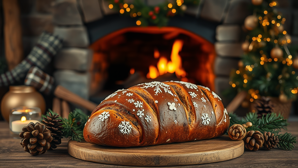Still life featuring a traditional Christmas stollen bread surrounded by a rich black and gold color palette, set in a room with a rustic wood-burning oven emitting a warm, cozy glow. The scene captures intricate details with photorealistic lighting, showcasing a wide-angle view that emphasizes a blend of rustic charm and modern elegance. The composition reflects the essence of kinfolk photography and A+D architecture, incorporating subtle holiday decorations for an inviting, festive atmosphere.