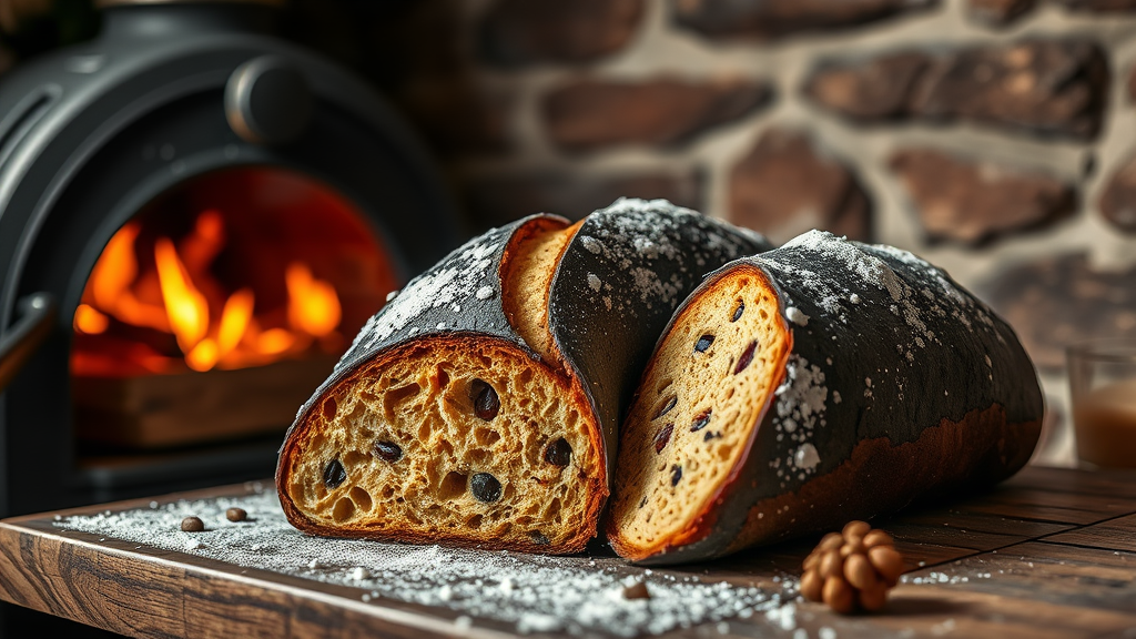 Still life featuring artisanal Christmas stollen bread, a harmonious blend of black and gold hues, nestled beside a wood-burning oven in a snug, inviting setting; captured in 8k resolution with mesmerizing detail and photorealistic lighting, presented in a wide-angle perspective, with kinfolk photography style and elegant A+D architectural influences, adding a touch of warmth and sophistication.