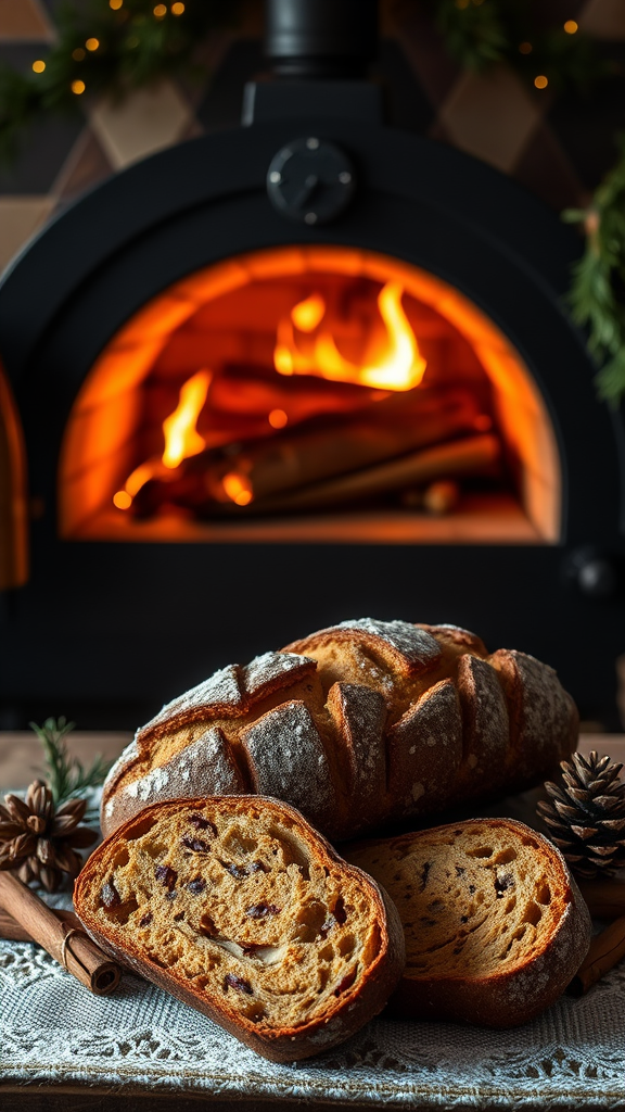 Still life featuring traditional Christmas stollen bread against a backdrop of a classic wood-burning oven, surrounded by a luxurious black and gold color palette. The scene exudes a warm, cozy atmosphere, captured in 8k resolution with intricate details and photorealistic light. The wide-angle kinkfolk photography highlights the artisanal craftsmanship and A+D architectural elements, adding a touch of elegance with a few cozy winter decor elements like pine cones and cinnamon sticks for a festive twist.