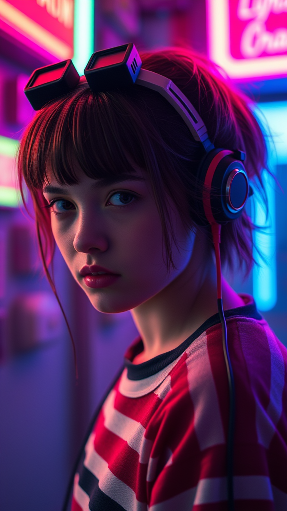 Stranger Thing-inspired scene featuring a character styled like Eleven with sensors on her head, bathed in synthwave aesthetic with realistic, cinematic lighting, vibrant neon colors illuminating the background, captured in a dramatic 4:7 aspect ratio.