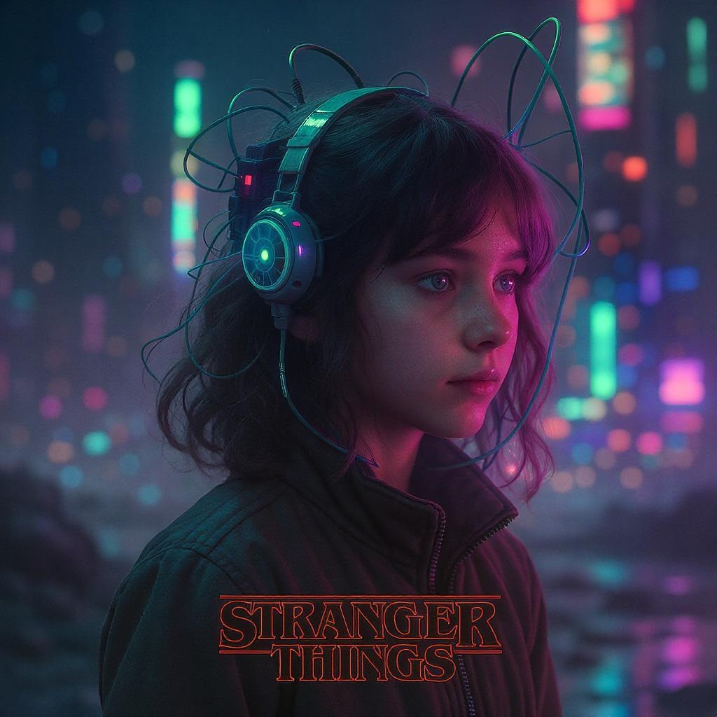 Stranger Things inspired, a young girl with psychokinetic powers, futuristic sensors on her head, synthwave aesthetics, realistic portrayal with cinematic lighting, neon ambiance, immersive and dynamic atmosphere, set in a mysterious, otherworldly landscape, ratio 4:7.