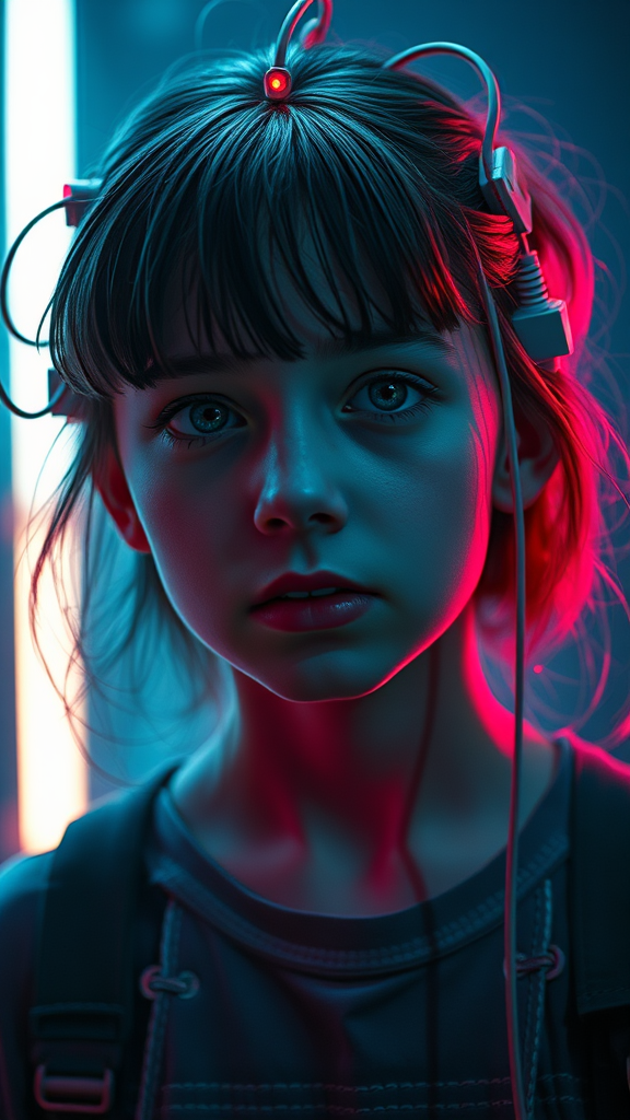 Stranger Things inspired, young girl with supernatural abilities, electrodes attached to her head, 80s synthwave vibe, realistic detail, cinematic lighting, neon glow, elongated composition 4:7 ratio, captivating and mysterious atmosphere.