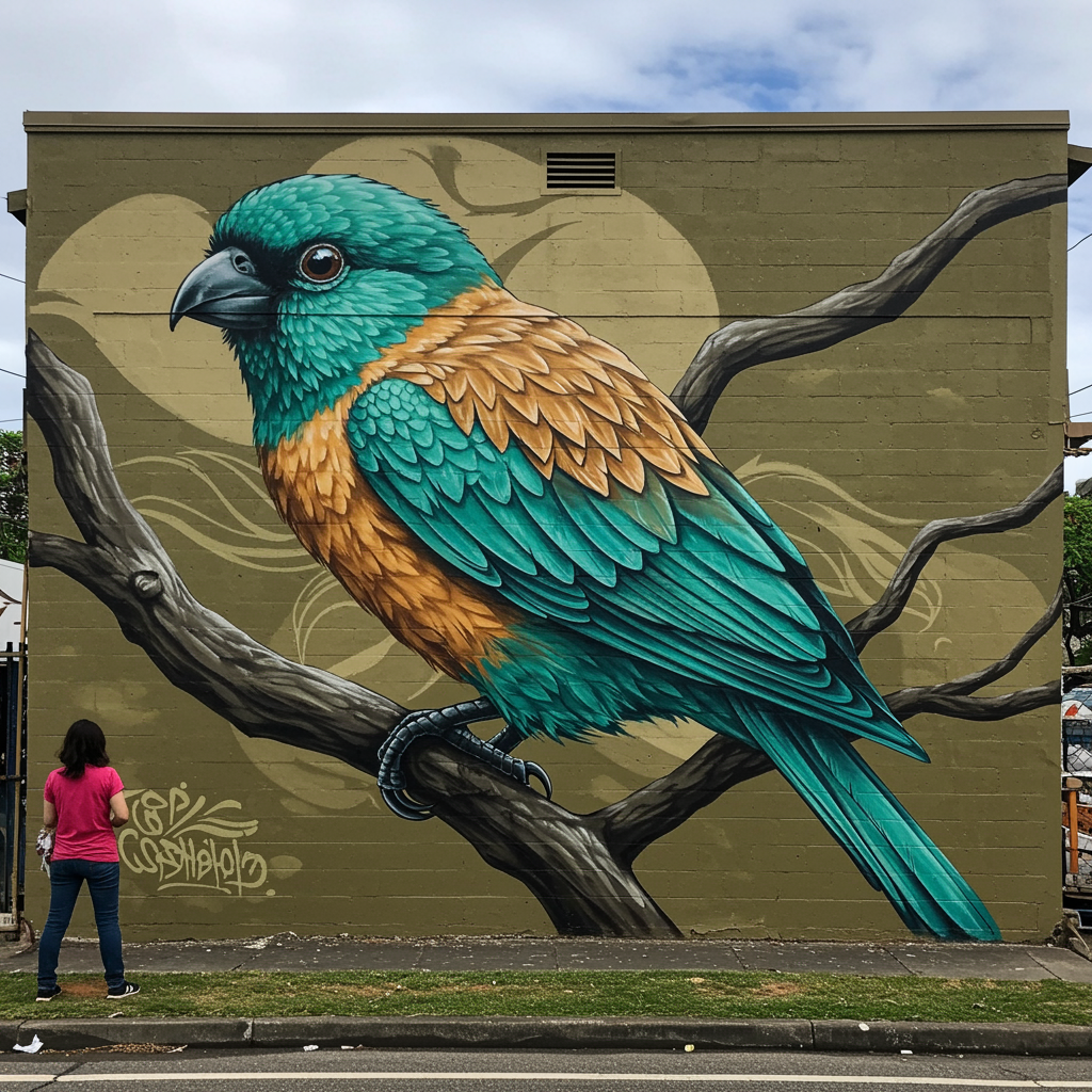 street art by chrysalis in hawaii featuring life-like avian illustrations, hues of aquamarine and amber, inspired by dayak art, captured through an olympus af-1 lens, monumental scale, enriched with elements of comic figurativism, vibrant #screenshotsaturday ambiance
