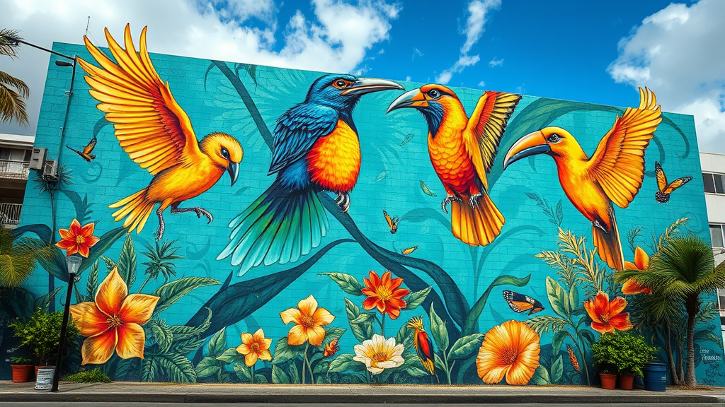 Street art mural by Chrysalis in Hawaii depicting vibrant, life-like avian illustrations, featuring colors of aquamarine and amber, inspired by Dayak art. Captured in the style of an Olympus AF-1 photograph, the artwork is created on a gigantic scale, showcasing elements of comic figurativism with dynamic movement and intricate details, reflecting the cultural vibrancy and natural beauty of the setting. #screenshotsaturday