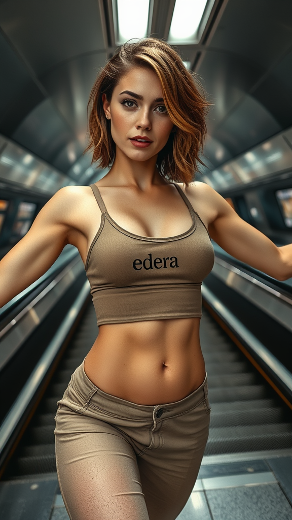 Street fashion shot from a distance of a 24-year-old Montenegrin-Italian female with classic Hollywood beauty and a warm, inviting expression. She has light beige skin with subtle freckles across her cheeks and shoulders, skin pores and texture clearly visible. Her light brown, deep-set triangular eyes are framed by long, elegant eyelashes. She has feathered layered hair that frames her face. Her eyebrows are tapered with a peak that complements her delicate facial features. Her physique showcases a tight, flat stomach with visible muscle grooves, small breast, and toned abs, exuding a female bodybuilding style. She wears an upper body garment with an "edera" label sewn onto the front, leaving her midriff clearly visible. Her pose is dynamic and celebratory, positioned on the left side of the frame by the rule of thirds, with one leg extended forward and arms wide, creating an energetic scene. In the background, a modern subway station features sleek, polished metal panels, glowing LED signs, and long escalators descending into the underground for a futuristic and urban vibe. Bright daylight filters through a botanical garden, adding lush greenery and vibrant colors that enhance the colorful outfits for a fresh, lively look. Soft natural lighting in the style of Yu Ngiang gently illuminates the model.