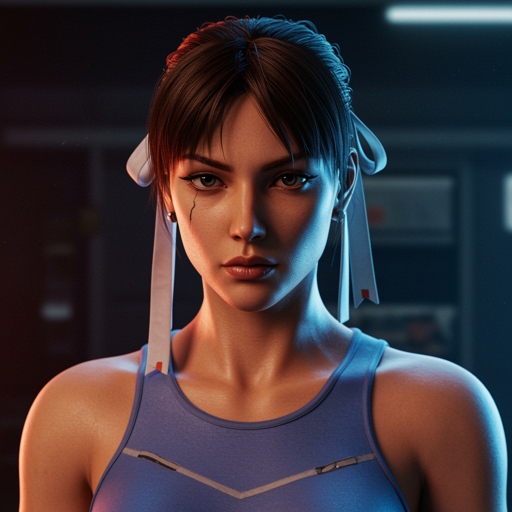 Street Fighter, 1980s sci-fi aesthetic, video game characters, Chun-Li, modelshoot style photography, Armorgirl, highly detailed face inspired by Greg Rutkowski and Magali Villeneuve, captivating eyes, athletic physique, cinematic lighting, hyperrealistic photography, emphasis on beauty and detail, steely gaze, strong posture, power and elegance, futuristic influence, dynamic pose, seamless blend of classic and contemporary, focus on texture and expression, intense atmosphere, refined presentation, immersive and engaging visual narrative.