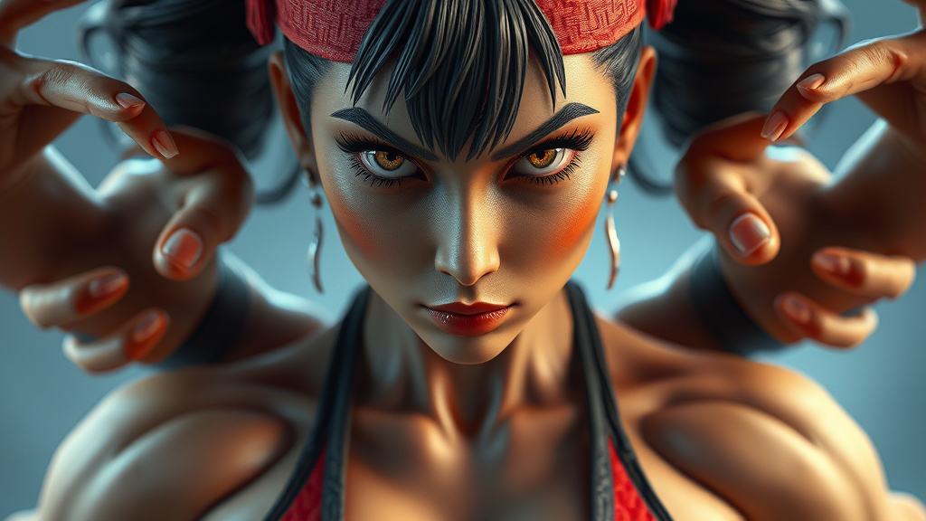 Street Fighter, Chun-Li inspired character, intricate facial features by Greg Rutkowski and Magali Villeneuve, captivating eyes, athletic physique, cinematic lighting, hyperrealistic, 3D photography, doll-like quality, octane render, intentional flaws, abstract anatomy, blurred elements, multiple arms, numerous fingers, distorted hands, asymmetrical, deformed, altered proportions, surreal mutations.