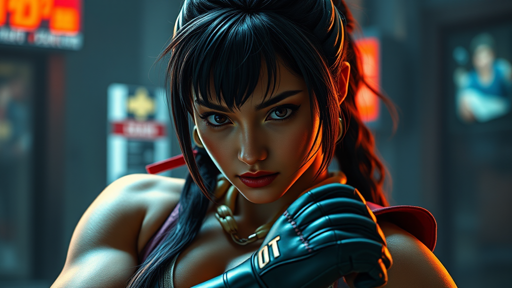 Street Fighter-inspired 1980s sci-fi style featuring video game characters, with a focus on Chun-Li in a MODELSHOOT style. Photography of ARMORGIRL with a highly detailed face reminiscent of Greg Rutkowski and Magali Villeneuve, showcasing beautiful eyes and a toned body. Emphasizing cinematic lighting and hyperrealism, capturing a dynamic and vibrant image. Avoid distractions like low quality, deformation, and unnatural anatomy, ensuring a visually captivating and polished portrayal without errors or artifacts.