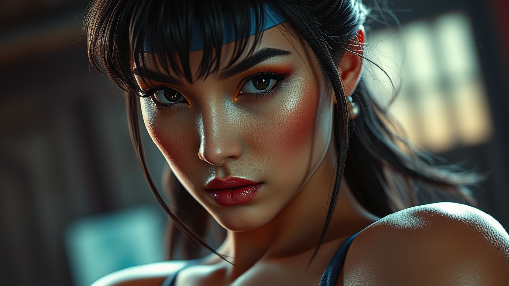 Street Fighter-inspired, 1980s sci-fi style video game character featuring Chun-Li, MODELSHOOT STYLE, PHOTOGRAPHY, ARMORGIRL, highly detailed face reminiscent of work by Greg Rutkowski and Magali Villanueve, beautiful eyes, toned body, cinematic lighting, Hyperrealism. The scene captures the essence of a highly detailed, polished, high-quality portrayal, with emphasis on striking features and powerful presence. Eliminate any elements of poor quality or deformations, focus on accurate anatomy, and ensure a professional, high-resolution finish.