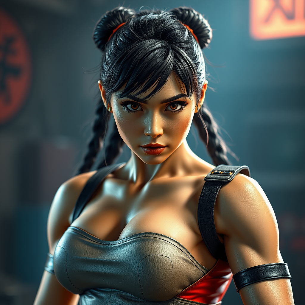 Street Fighter-inspired 1980s sci-fi style video game character, featuring Chun-Li in a MODELSHOOT STYLE with photography influences, ARMORGIRL, highly detailed face inspired by Greg Rutkowski and Magali Villeneuve, with beautiful eyes and a toned body, cinematic lighting, Hyperrealism photography, capturing the essence of a strong and striking figure. Maintaining the retro-futuristic essence, the scene is devoid of unnecessary distractions, focusing on clean, high-quality visuals and accurate anatomy. The backdrop evokes a sense of depth and storytelling, highlighting Chun-Li's powerful presence without flaws or low-quality elements, ensuring an immersive and coherent representation of the character.