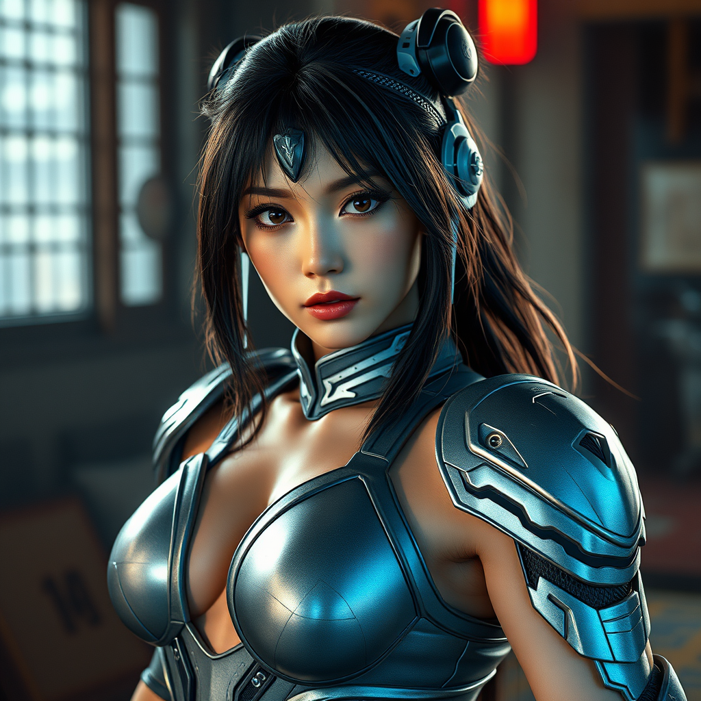 Street Fighter-inspired 1980s sci-fi video game character Chun-Li in a model shoot style. Captured through the lens of photography, this depiction by artists similar to Greg Rutkowski and Magali Villeneuve showcases a hyperrealistic image with beautiful eyes and a toned physique. The scene is set with cinematic lighting highlighting an intricate, futuristic armor outfit. The emphasis is on creating a highly detailed, artistic portrayal with a focus on realism and quality, avoiding any elements that compromise visual integrity or introduce distortions.