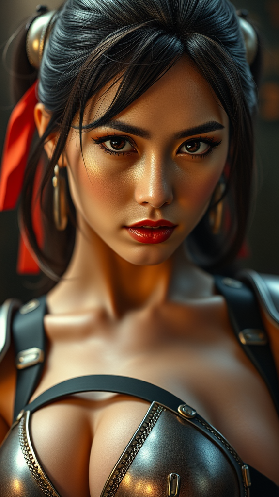 Street Fighter-inspired 1980s sci-fi video game character featuring Chun-Li in a modelshoot style, with photography emphasis. She is captured in an armorgirl theme, with a highly detailed face reminiscent of Greg Rutkowski and Magali Villanueve's work, showcasing beautiful eyes and a toned body under cinematic lighting. The scene focuses on hyperrealism and photography, bringing out a striking level of detail and vibe.