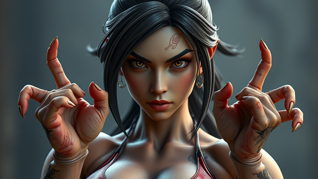 Street Fighter-inspired character, Chun-Li, detailed face with influences from Greg Rutkowski and Magali Villeneuve, captivating eyes, athletic physique, cinematic lighting, hyperrealism, photographic 3D style, doll-like features, rendered with octane, intentional imperfections, additional limbs, extra fingers, malformed hands, distorted anatomy, abstract tiling, deformed and mutated aesthetic.