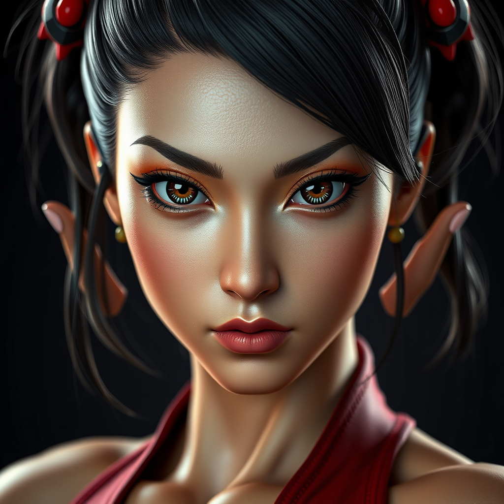 Street Fighter-inspired character, Chun-Li, detailed and expressive face, capturing the styles of Greg Rutkowski and Magali Villanueve, strikingly beautiful eyes, athletic physique, cinematic lighting, hyperrealistic photography with a 3D effect, doll-like features, rendered in octane. Elements of artistic imperfection such as unusual anatomy, slightly blurry details, unconventional number of arms and fingers, imperfectly drawn hands, unique distortions, tiling patterns, and intriguing mutations.