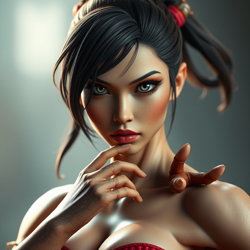 Street Fighter inspired character, Chun-Li essence, crafted by greg rutkowski and magali villanueve, striking eyes, athletic physique, dramatic lighting, hyperrealistic style, photographic 3d quality, doll-like features, octane-rendering, slightly surreal anatomy, soft focus, additional limbs and fingers, abstract hands, distorted, mosaic-like texture, intriguingly mutated forms.