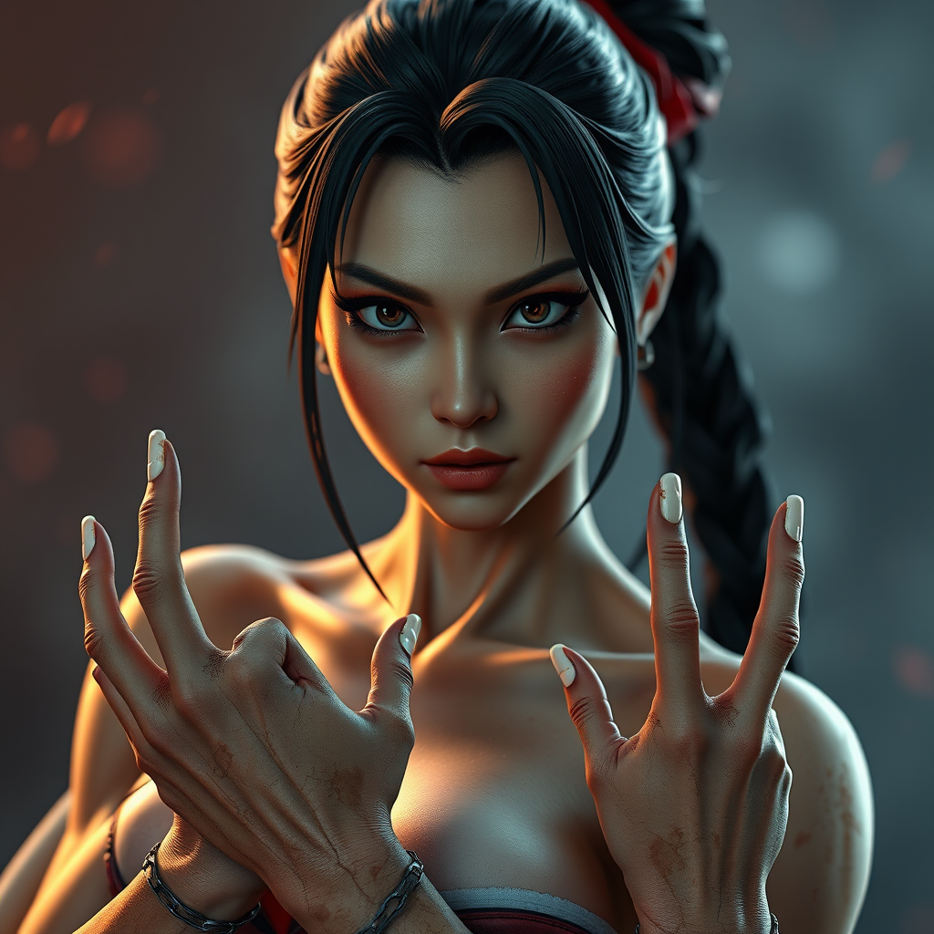 Street Fighter-inspired, Chun-Li, intricately detailed face resembling work by Greg Rutkowski and Magali Villeneuve, captivating eyes, athletic physique, cinematic lighting, hyper-realistic 3D photographic style, doll-like features, rendered with octane, surrealistic anatomy with blurred elements, multiple arms and fingers, unusual hand placement, abstract and distorted forms, visually fragmented, artistically mutated.