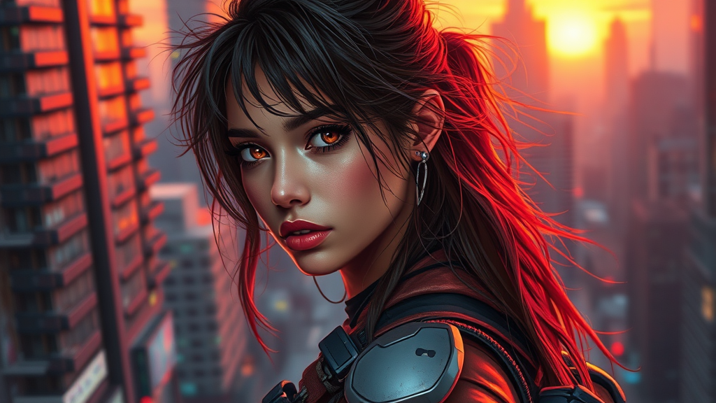 Street grunge style portrait of a young stunning cyberpunk woman with tousled long hair, embodying the spirit of rebellion, clad in futuristic riot gear. The background is a sprawling cyberpunk megacity bathed in the hues of a setting sun. The scene is rendered in the vibrant, detailed digital paint style reminiscent of Mike Winkelmann, capturing the intensity with a slight touch of blur and noise for a raw, immersive effect.