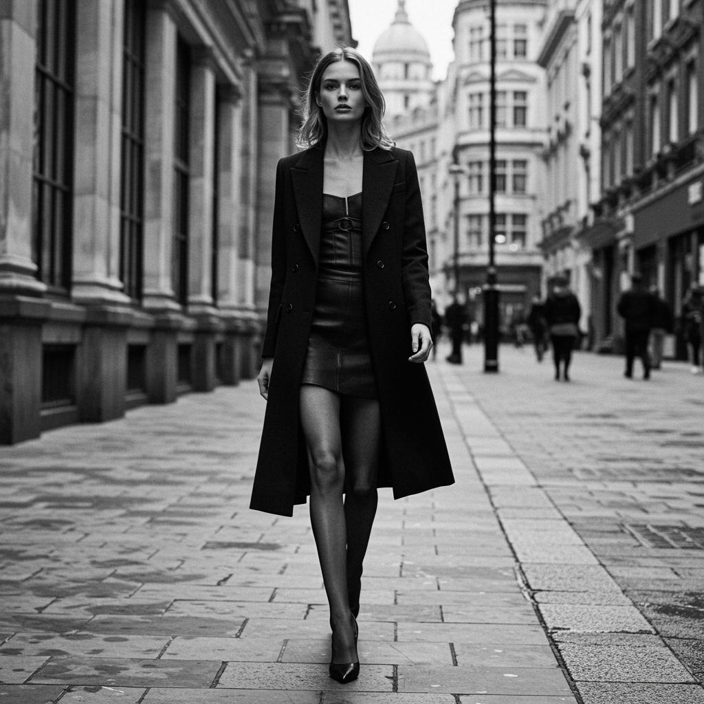Street photography captures an alluring woman in the bustling streets of London. The monochrome scene immortalizes her confident stride amidst iconic city architecture, shot using an Arriflex 35 BL camera paired with Canon K35 Prime lenses. The image artistically embraces the chaos of urban life, balancing elegance with the gritty atmosphere. Bathed in natural light, the photograph emphasizes sharp contrasts and intricate textures, drawing focus to the woman's enigmatic expression. She effortlessly blends into the dynamic backdrop, merging personal style with the city's timeless charm, all while exuding an air of mystery.