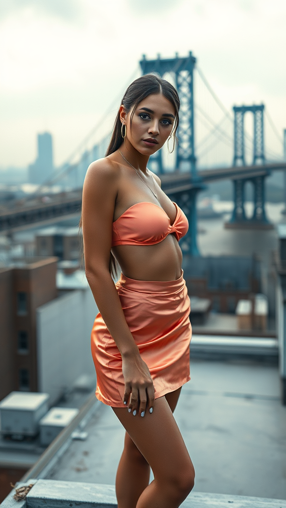 View this AI-generated image featuring a captivating street style image of a stunning slender and playful woman with an instagram worthy vibe poised gracefully on the rooftop of a tall building she wears a mini salmon hued sheer satin skirt in the background the iconic brooklyn bridge spans majestic
