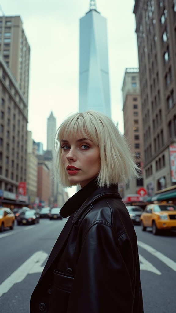 Street style photo of a grunge fashion woman in the busy streets of mid-1990s Manhattan, standing in front of a sleek silver skyscraper, sporting a platinum blonde 90s bob reminiscent of Carly Norris from the film Sliver, captured in natural light, shot with the nostalgic tones of Agfa Vista 200, with an urban vibe and a hint of artistic flair.