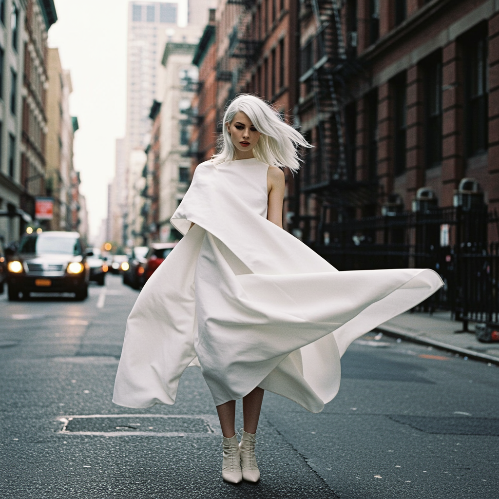 View this AI-generated image featuring street style photo featuring a young woman with platinum white hair donning a sleek white avant garde dress with an ethereal quality subtly defying gravity captured in natural light against the urban backdrop of soho with vibrant colors and soft grain of agfa v