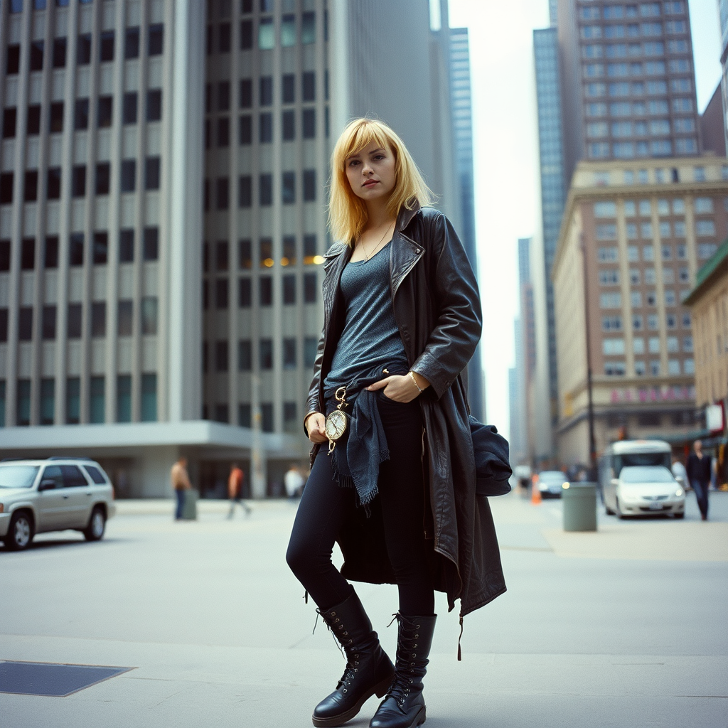 Street style photo capturing a grunge chic woman in 1990 Manhattan, posing against a sleek high-rise building, her blonde 90s bob reminiscent of Carly Norris from Sliver, dressed in edgy layers and combat boots, natural lighting highlighting the authenticity, evoking the aesthetic of a shot on Agfa Vista 200, with bustling city life in the background.