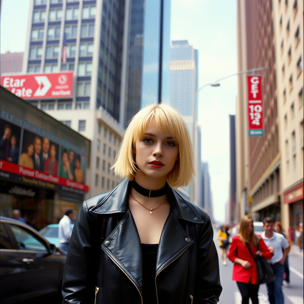 Street style photo of a grunge-inspired woman in the bustling streets of 1990 Manhattan, positioned in front of a sleek high rise building. She sports a choppy blonde 90s bob reminiscent of Carly Norris from the film Sliver. The scene is captured in natural daylight, giving it an authentic vibe, and shot on Agfa Vista 200 film. The background architecture complements her look with an urban edge, and the overall mood hints at the vibrant, eclectic style unique to the era.