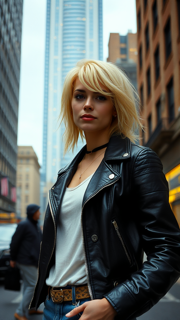 Street style photo of a grunge-inspired woman in the bustling streets of 1990 Manhattan, posed confidently in front of a gleaming high-rise building, her platinum blonde hair catching the city light, wearing a worn leather jacket reminiscent of Carly Norris from Sliver, captured in natural lighting on Agfa Vista 200 film, with a dreamy bokeh effect and depth of field at f/1.8, exuding a mysterious allure.